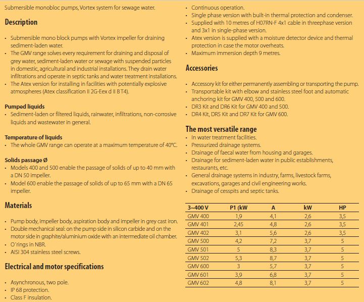 • Submersible mono block pumps with Vortex impeller for draining sediment-laden water. • The GMV range solves every requirement for draining and disposal of grey water, sediment-laden water or sewage with suspended particles in domestic, agricultural and industrial installations. They drain water infiltrations and operate in septic tanks and water treatment installations. • The Atex version for installing in facilities with potentially explosive atmospheres (Atex classification II 2G-Eex d II B T4).
