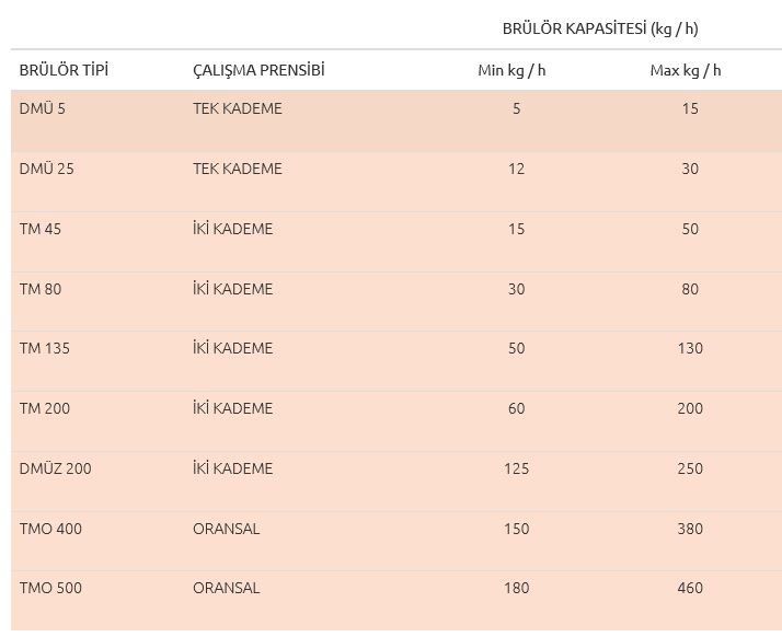 DMÜ ve TM tip brülörler fuel oil kullanımı içindir. Bu brülörler yakıtı ısıtarak vizkozitesini düşürmek üzere bir ön ısıtıcı ile donatılmıştır. Elektrikli ısıtma sistemleri takılmış ön ısıtıcıda yağ sıcaklığı alt ve üst limitleri ile çalışma devresi, özel bir termostat tarafından kumada edilir. Ayrıca ağır yağın verimli bir şekilde yakılabilmesi için brülöre bir meme çalkalama tertibatı ilave edilmiş ve ring sistemi ile ağır yağın homojen bir sıcaklık, temizlik ve akıcılıkta memeden püskürtülmesi temin edilmiştir. Brülörlerde tek kademeli veya iki kademeli tiplere göre bir veya iki adet yakıt memesi ve tamamında yüksek basınçlı özel bir yağ pompası bulunur. Oransal brülörde ise özel oransal tip meme mevcuttur. Ventillerin yolu açmasıyla basınçlı yakıt ateşlenir ve yanma teşekkül eder. Termostat kumandası ile brülör devreye girip-çıkarak ısı ihtiyacına cevap verir.