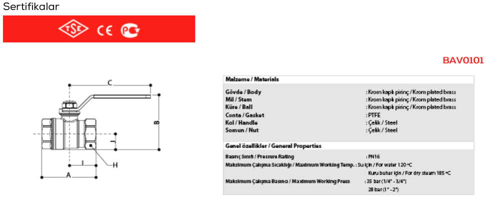 Basınç Sınıfı: PN16 Gövde: Krom Kaplı Pirinç Küre: Krom Kaplı Pirinç Kol: Çelik İç Dişli Bağlantı